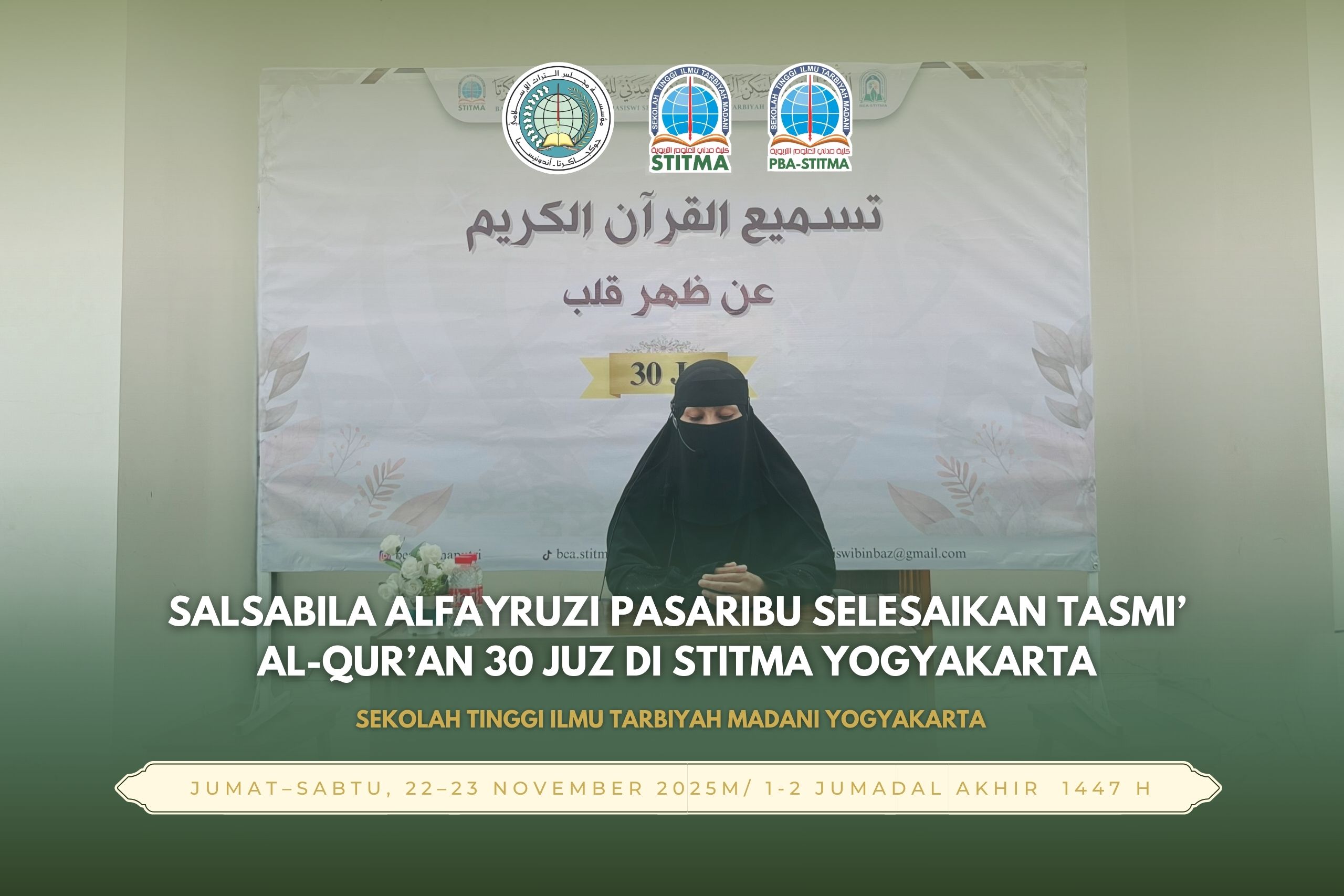 Bantul, 23 November 2025 – Alhamdulillah, puji syukur dipanjatkan ke hadirat Allah Jalla wa ‘Alaa atas terselenggaranya kegiatan Tasmi’ Al-Qur’an 30 Juz ‘an Ḍzohri Qalb yang dipersembahkan oleh mahasiswi Program Studi Pendidikan Bahasa Arab (PBA) STITMA Yogyakarta, Salsabila Alfayruzi Pasaribu binti Fayruz Arrodhie Pasaribu, mahasiswa semester V. Kegiatan ini berlangsung selama dua hari, Jumat–Sabtu, 22–23 November 2025, di Masjid Syaikh Fahd bin Jakhdab, Kampus STITMA Putri.