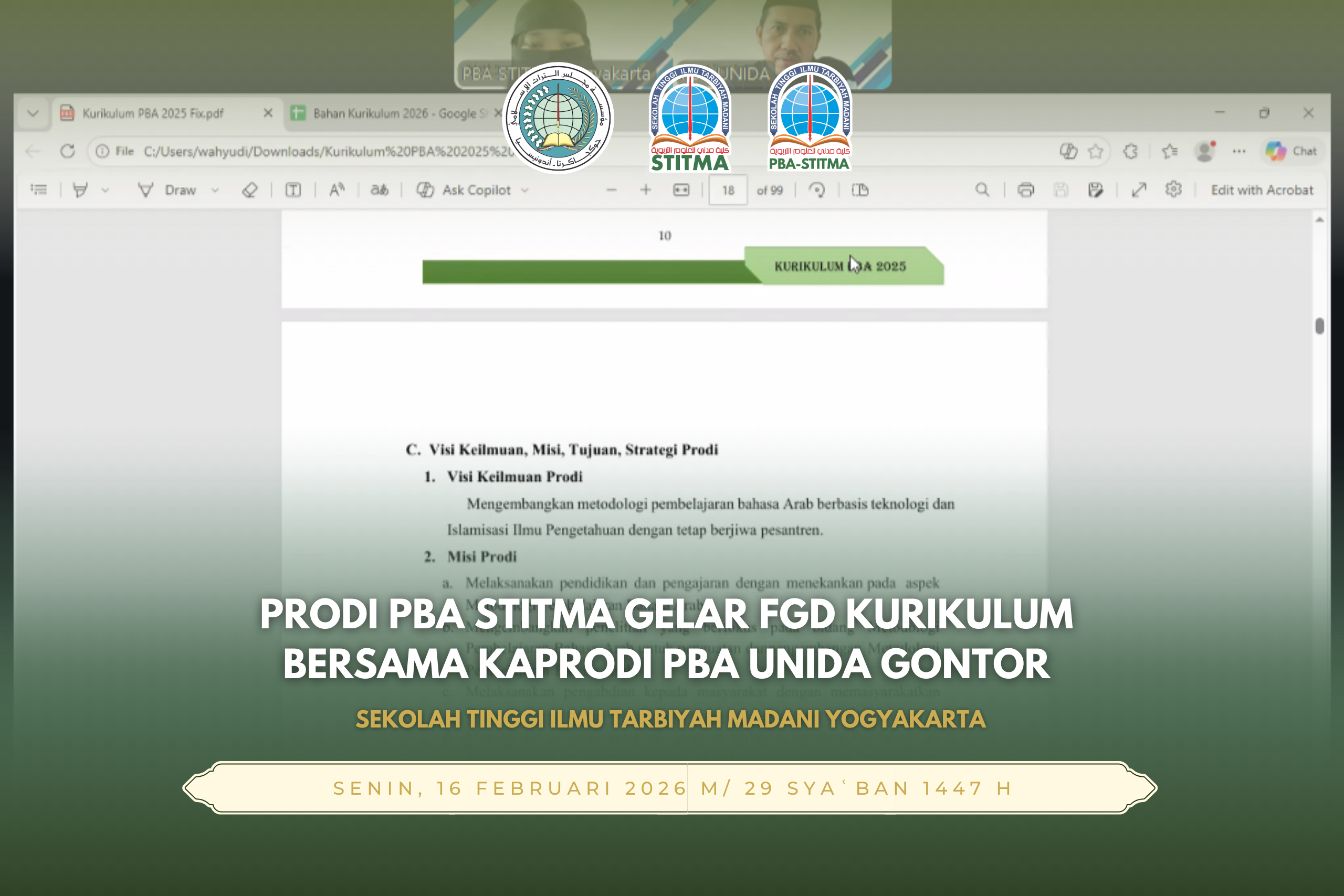 Program Studi Pendidikan Bahasa Arab (PBA) STITMA menggelar Focus Group Discussion (FGD) pengembangan kurikulum secara daring melalui Zoom pada Senin, 16 Februari 2026. Kegiatan ini menghadirkan narasumber utama, Muhammad Wahyudi, selaku Kaprodi PBA UNIDA Gontor, serta diikuti oleh pimpinan program studi.
